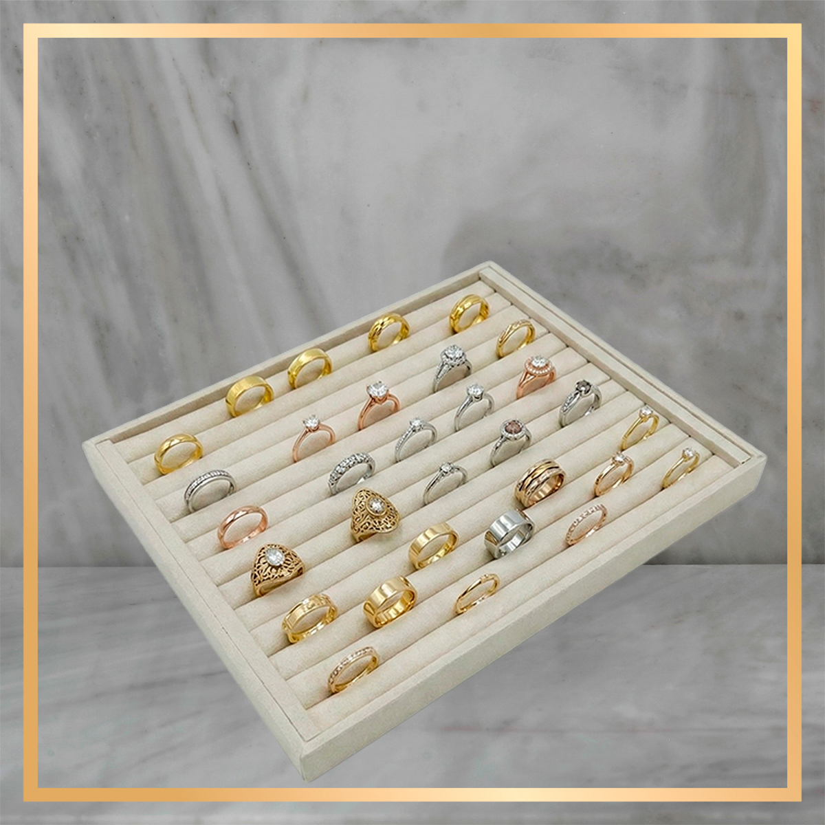 Com medidas generosas de 36 cm de largura x 29,5 cm de comprimento x 3 cm de altura, oferece amplo espaço para organização, mantendo seus anéis bem posicionados e visualmente atrativos.