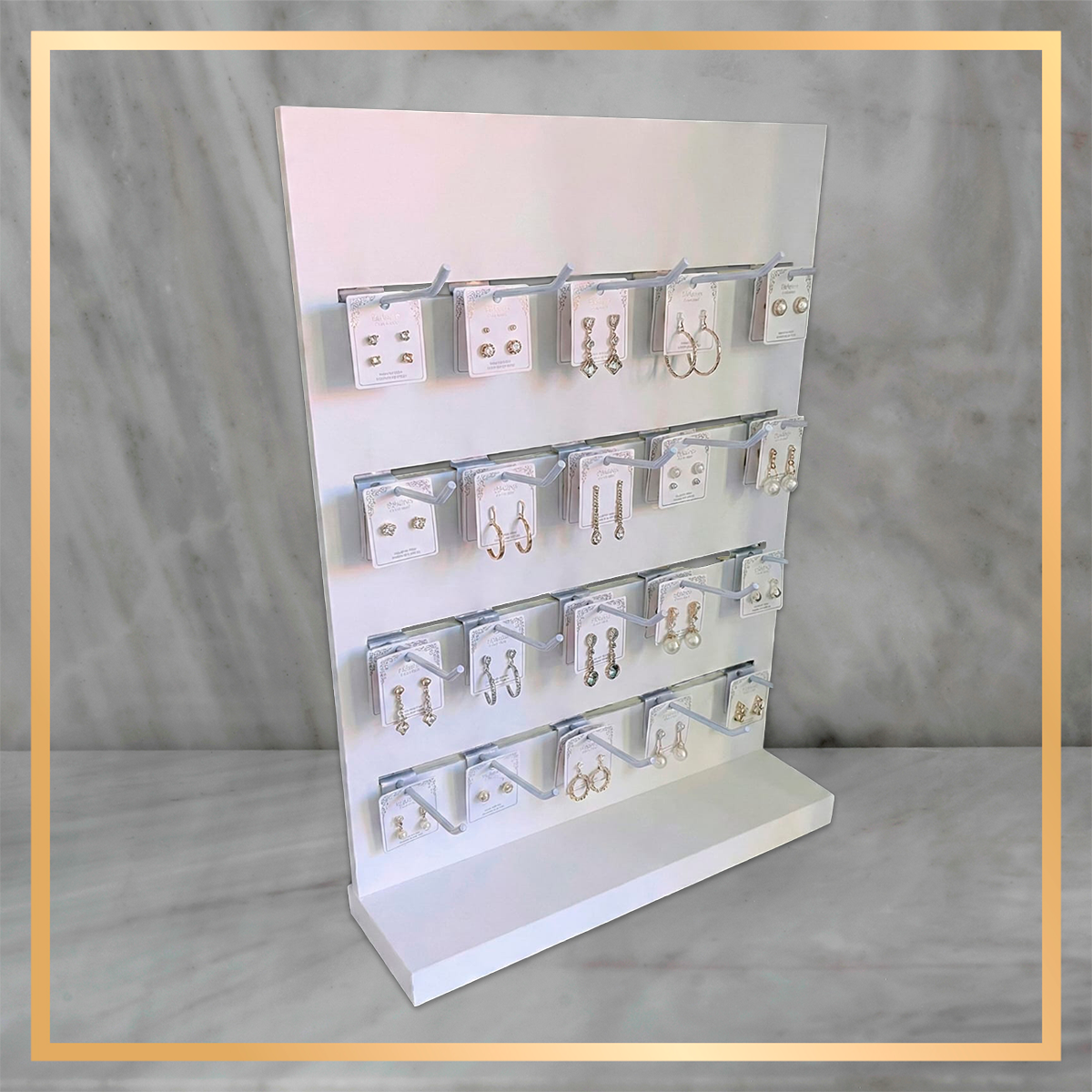 Painel expositor sofisticado e versátil, ideal para destacar joias, acessórios e pequenos produtos em vitrines, feiras ou pontos de venda. Produzido em MDF de alta qualidade com pintura laqueada branca e acabamento das bordas em dourado metalizado, este expositor une elegância e funcionalidade.