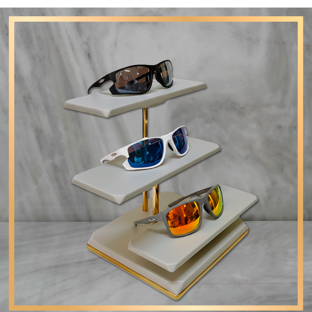 Apresente seus óculos com elegância e sofisticação com este expositor em formato de escada. Produzido com hastes de metal banhadas em dourado, o design moderno e equilibrado valoriza cada peça exposta, proporcionando destaque e organização.